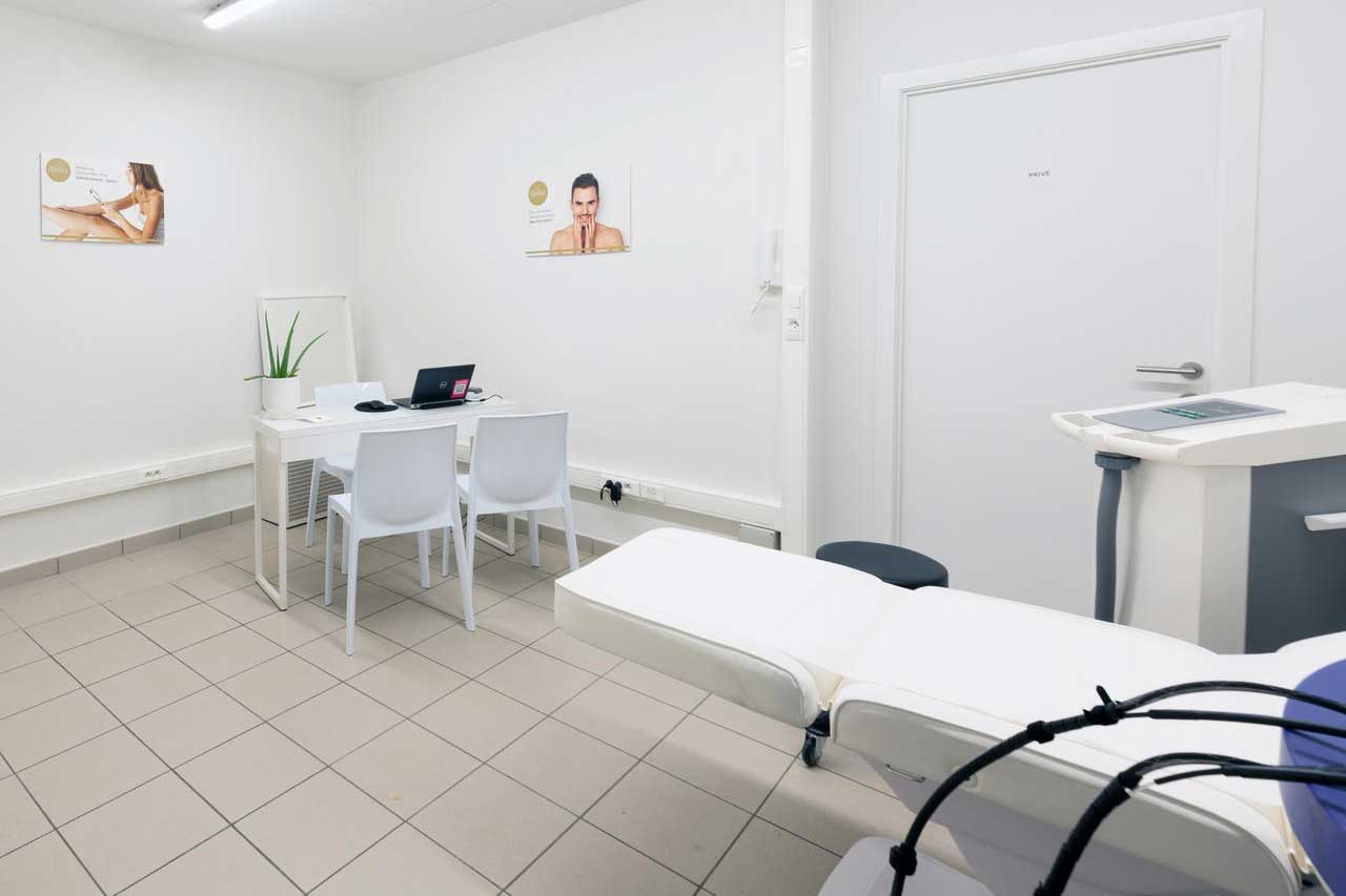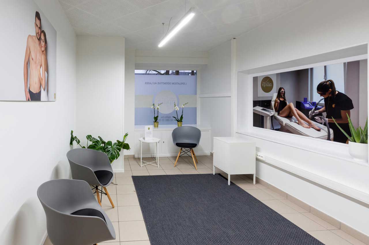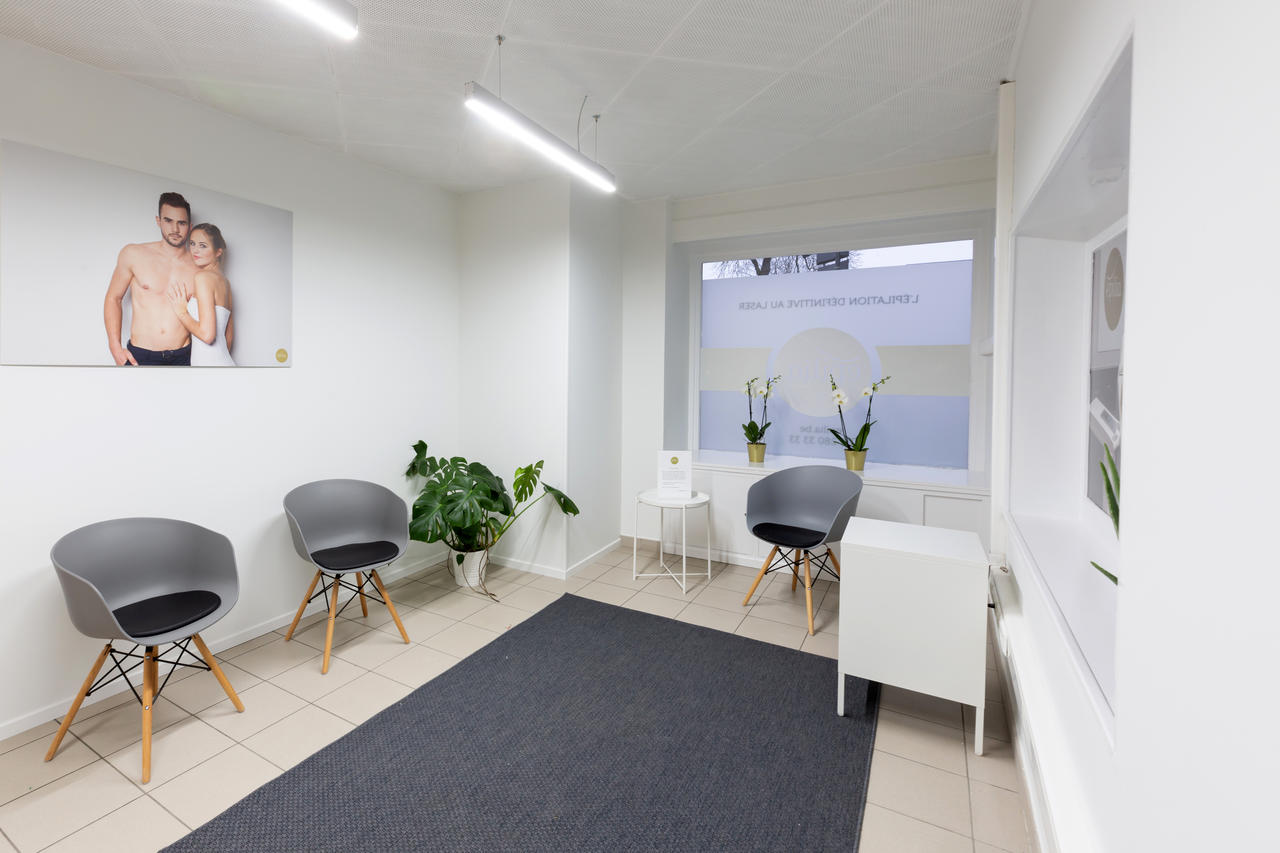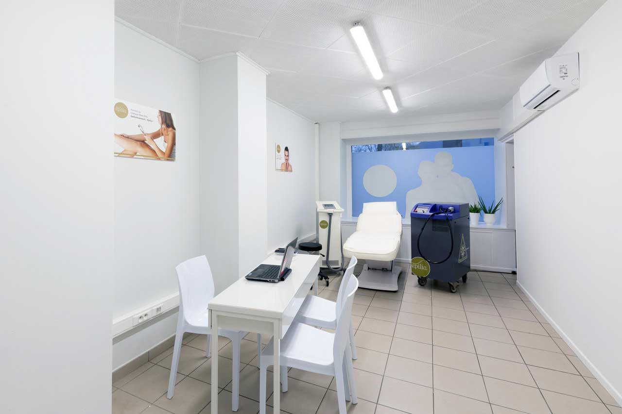Le centre d’épilation définitive, très épuré, se trouve au rez-de-chaussée d’un immeuble d’habitation.